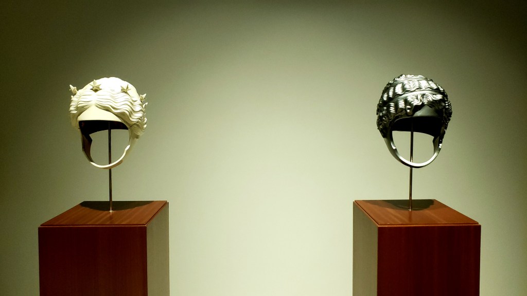 Este es el caso de “Meteora”, la nueva exposición de Fabián Bercic que presenta entre varias obras, una serie de cascos ancestrales que brillan como parte de seres provenientes del futuro. Una enunciación pregnante e impoluta que pareciera pertenecer a la heráldica de blasones y escudos antiguos, pero con colores vivos y plenos que nos vincula con el mundo actual.