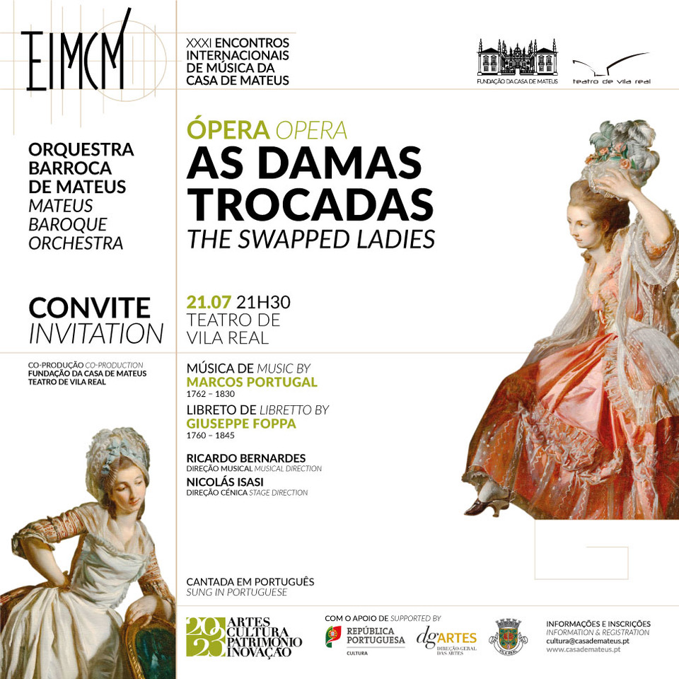 El próximo 21 de julio, el evento más importante en la programación de la XXXI edición de los Encuentros Internacionales de Música en Casa de Mateus será el estreno de la ópera “As Damas Trocadas ou o Diabo a Quatro”, de Marcos Portugal. Esta nueva versión contará con la dirección escénica de Nicolás Isasi en su debut europeo y la dirección musical del maestro Ricardo Bernardes a cargo de la Orquestra Barroca de Mateus con instrumentos de época.