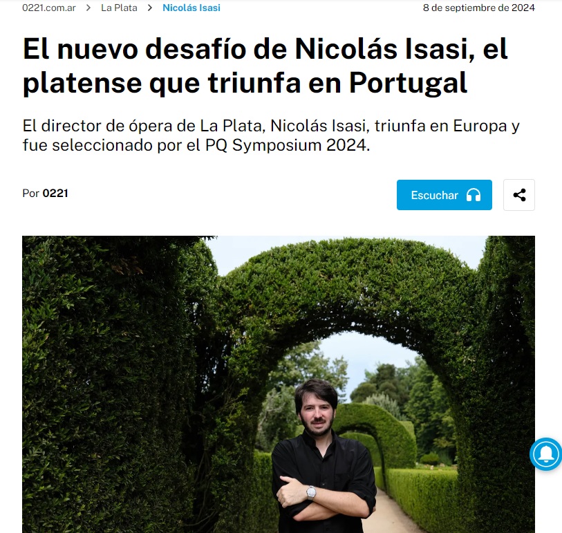 El joven director de La Plata, Nicolás Isasi, que despegó con la dirección de «As Damas Trocadas» en el Teatro Municipal de la ciudad de Vila Real en Portugal durante el 2023, fue seleccionado para participar en el Simposio PQ 2024: Tecnologías en Teatro, Performance y Diseño de Exposiciones, organizado por la Cuadrienal de Performance y Diseño Espacial de Praga.